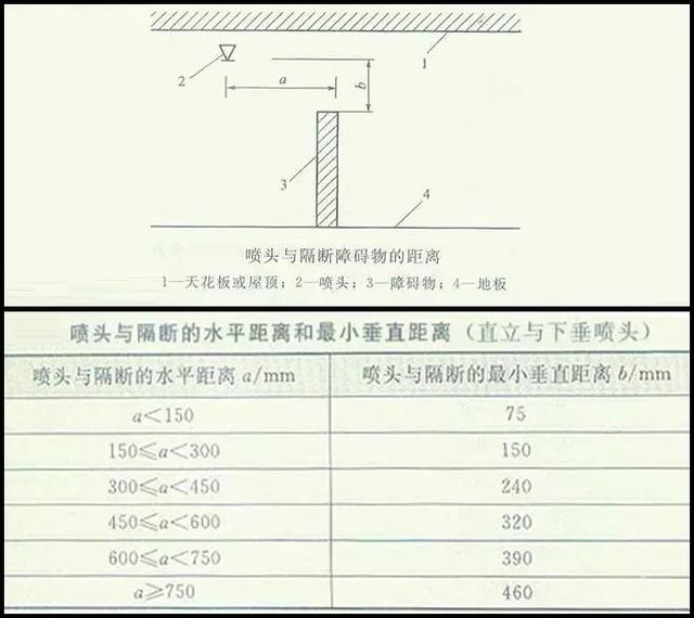 · 当喷头安装在不到顶的隔断附近时,喷头与隔断的水平距离和最小垂直距离应符合下表的规定: