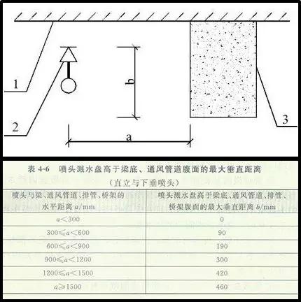 · 当喷头溅水盘高于附近梁底或宽度小于1.2m的风管、排管、桥架腹面时,喷头溅水盘高于梁底、风管、排管、桥架腹面的最大垂直距离应符合下表的规定: