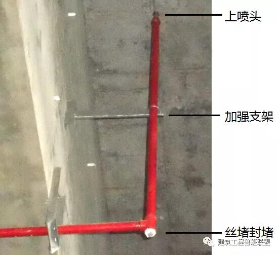 10 、风管下喷头吊架应采取管道延长至风管另外一端边缘,并在延伸管道末端设置吊架。