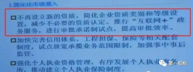 第五、没有取消的资质改革的趋势?住建部明确提出今年将修订资质标准,简化资质考核条件,重点考核企业信誉和业绩等指标。试点开展对信用良好、能够提供全额担保的企业,取消承揽业务范围资质限制。企业经营的核心是信誉与业绩,这是资质将引导的方向,也是趋势。