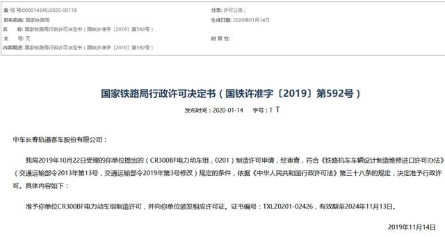 准予你单位CR300BF电力动车组制造许可,并向你单位颁发相应许可证。证书编号:TXLZ0201-02426,有效期至2024年11月13日。