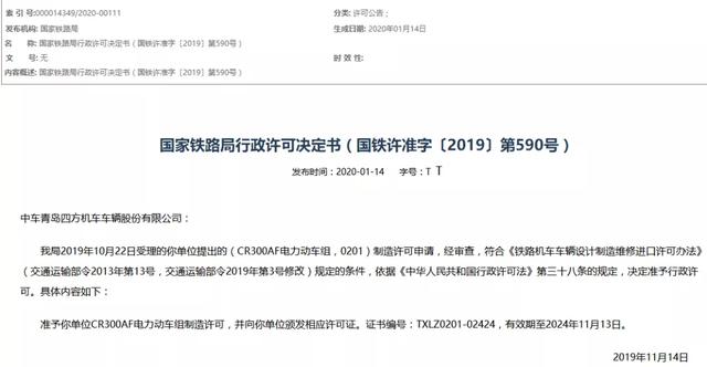 准予你单位CR300AF电力动车组制造许可,并向你单位颁发相应许可证。证书编号:TXLZ0201-02424,有效期至2024年11月13日。