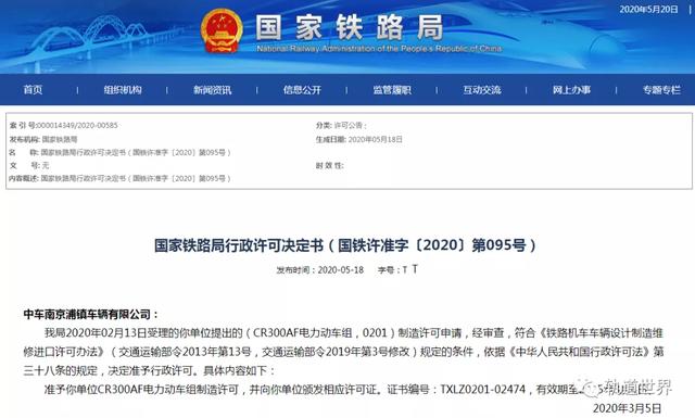 我局2019年10月22日受理的你单位提出的(CR300AF电力动车组,0201)制造许可申请,经审查,符合《铁路机车车辆设计制造维修进口许可办法》(交通运输部令2013年第13号,交通运输部令2019年第3号修改)规定的条件,依据《中华人民共和国行政许可法》第三十八条的规定,决定准予行政许可。具体内容如下: