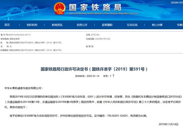 我局2019年10月22日受理的你单位提出的(CR300BF电力动车组,0201)制造许可申请,经审查,符合《铁路机车车辆设计制造维修进口许可办法》(交通运输部令2013年第13号,交通运输部令2019年第3号修改)规定的条件,依据《中华人民共和国行政许可法》第三十八条的规定,决定准予行政许可。具体内容如下: