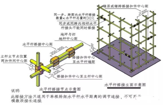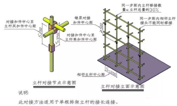 2.6立杆、水平杆的接长,以对接为主。对接扣件与支架扣件的中心距不得大于支架的跨距或步距的1/3,且离最近的支架主接点扣件不得大于300mm。其四周相邻的立杆的接头不应设置在同步内,同步内相邻立杆的接头在高度方向至少需错开500mm以上,且同一步、跨距内的搭接点不得大于杆件全数的30%。