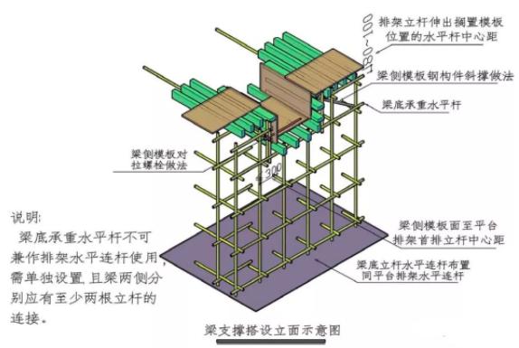 3.5梁底支撑立杆,其纵向(顺梁方向)应与周边板下立杆等间距或成模数设置,并由水平杆与相邻支撑立杆连成整体。