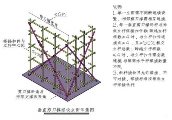 1.4垂直剪刀撑应在垂直面上和立杆形成45°~60°的夹角,并与立杆用旋转扣件相连接。垂直剪刀撑设置还需满足以下规定: