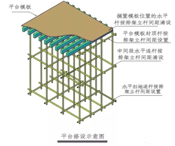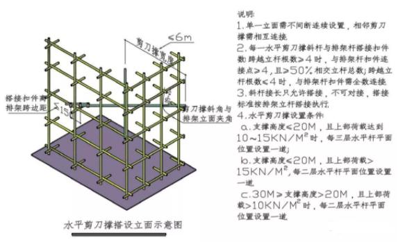 1.3水平剪刀撑应在水平面上与纵横向水平杆形成45°~60°的夹角,并与立杆用旋转扣件相连接。水平剪刀撑设置还需满足以下规定: