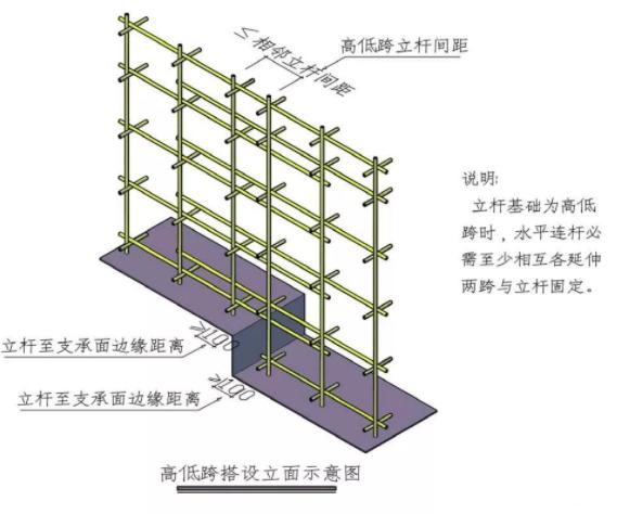 立杆:距离高跨边应≥200mm;距离低跨边应≥100mm。