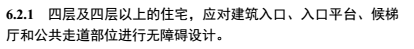 随着浙江省逐渐进入老龄化社会,老年人口迅速增加,其“上下楼困难”的问题日益突出,广大人民群众和新闻媒体都十分关注。为此,标准第5.3.1条强制规定“四层及四层以上住宅或住户入口层楼面距室外设计地面的高度超过10m时,必须设置电梯”,从源头上解决老年人的出行障碍,更好地满足老年人参与社会生活的需要。