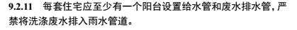 针对住户把污废水通过阳台雨水管网排放至河道,造成河道污染的问题,标准第9.2.11条强制规定“每套住宅应至少有一个阳台设置给水管和废水排水管,严禁将洗涤废水排入雨水管道”,同时第9.2.12条规定“阳台雨水立管底部应间接排水”,采取技术手段限制阳台污废水排入雨水管,双管齐下规范今后新建住宅污废水排放污染河道问题。