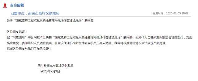 7月9日上午,南充市高坪区财政局在问政四川平台上进行了回复:作为负责政府采购监督管理部门,高坪区财政局高度重视,已经组织人员调查核实,目前该代理机构所在地公安机关已介入调查,财政局将根据调查情况依法依规严肃处理。