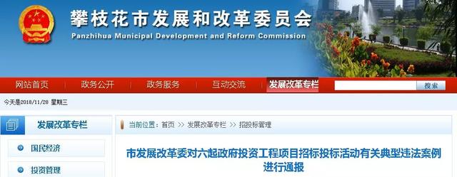 2018年8月,四川攀枝花市发改委对全市近三年来与政府投资工程项目招标投标活动有关的六起典型违法案例进行了通报: