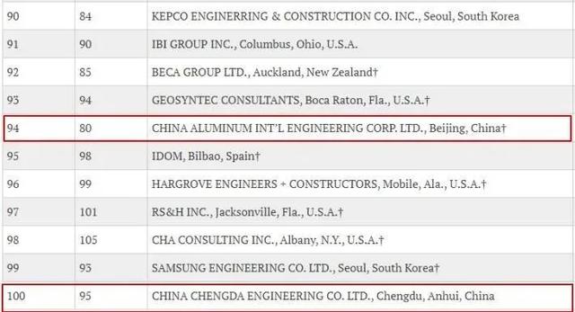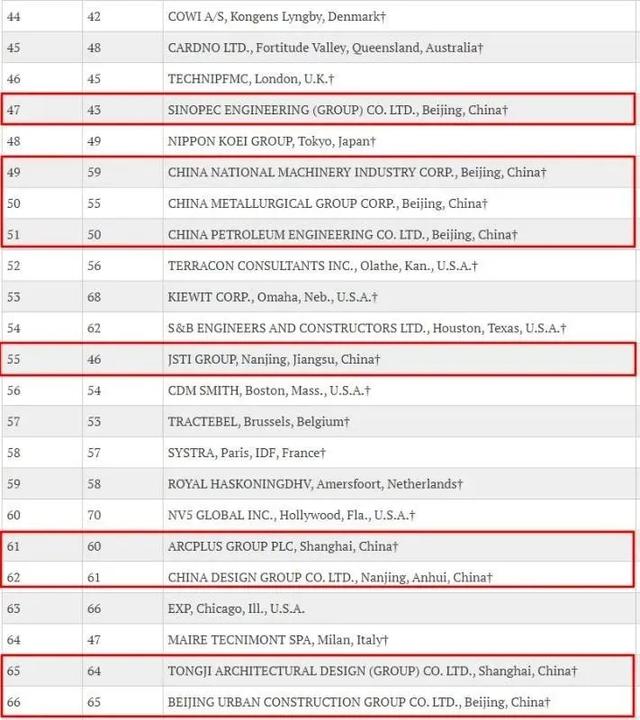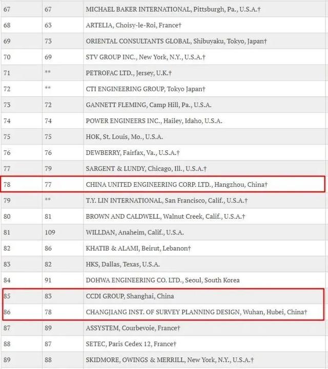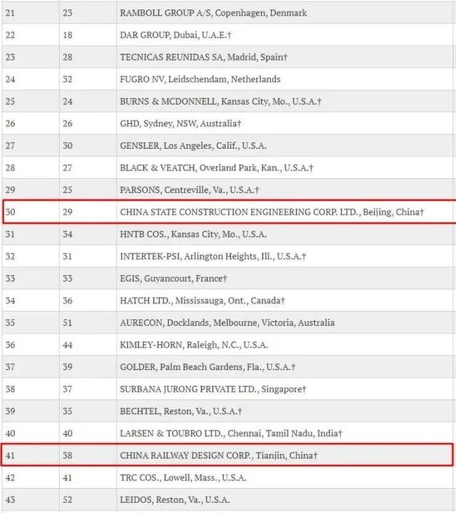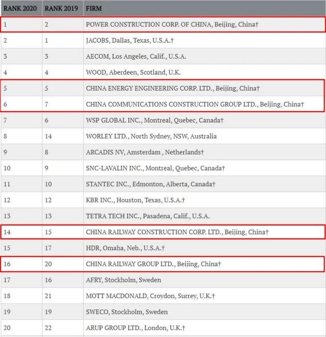 此榜单按2019年提供的全部设计服务总收入(以百万美元计),将全球所有的设计公司进行排名。中国电建以108.5亿美元的成绩位列榜单第一,较去年上升一位,成为全球最大的设计企业。中国能源建设集团、中国交通建设集团、中国铁道建筑集团、中国铁路工程集团分别位列第5、第6、第14、第16名。