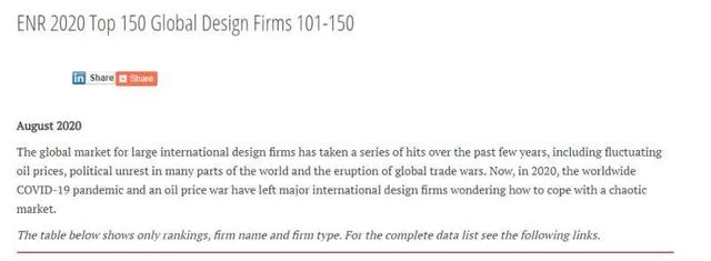 美国《工程新闻纪录》杂志(ENR)在榜单前言中表示:“过去几年,大型国际设计公司在全球市场受到了一系列冲击,包括油价波动、世界政治局势动荡以及全球贸易战爆发。2020年,世界范围内的新冠肺炎大流行和石油价格战使主要的国际设计公司不断探索如何应对混乱市场。”