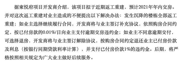 据東悦府项目开发商介绍,该项目拟于近期返工重建,预计2021年年内交房。并对这次返工重建对业主造成的不便提出以下解决办法: