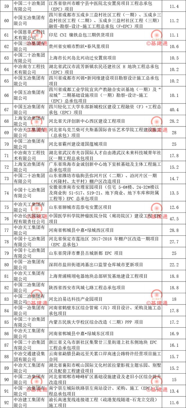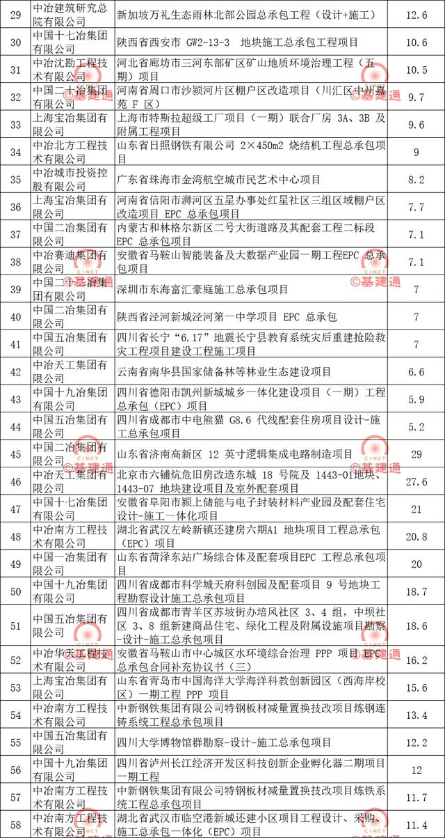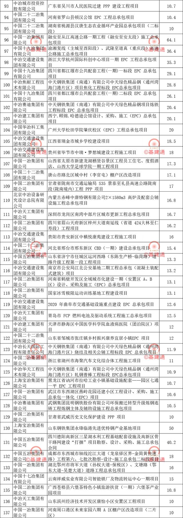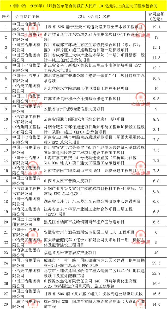 中国中冶 2020 年 1-7 月份新签单笔合同额在人民币 10 亿元以上的重大工程承包合同约 137 项,累计合同总额约 2184 亿元。具体的项目清单: