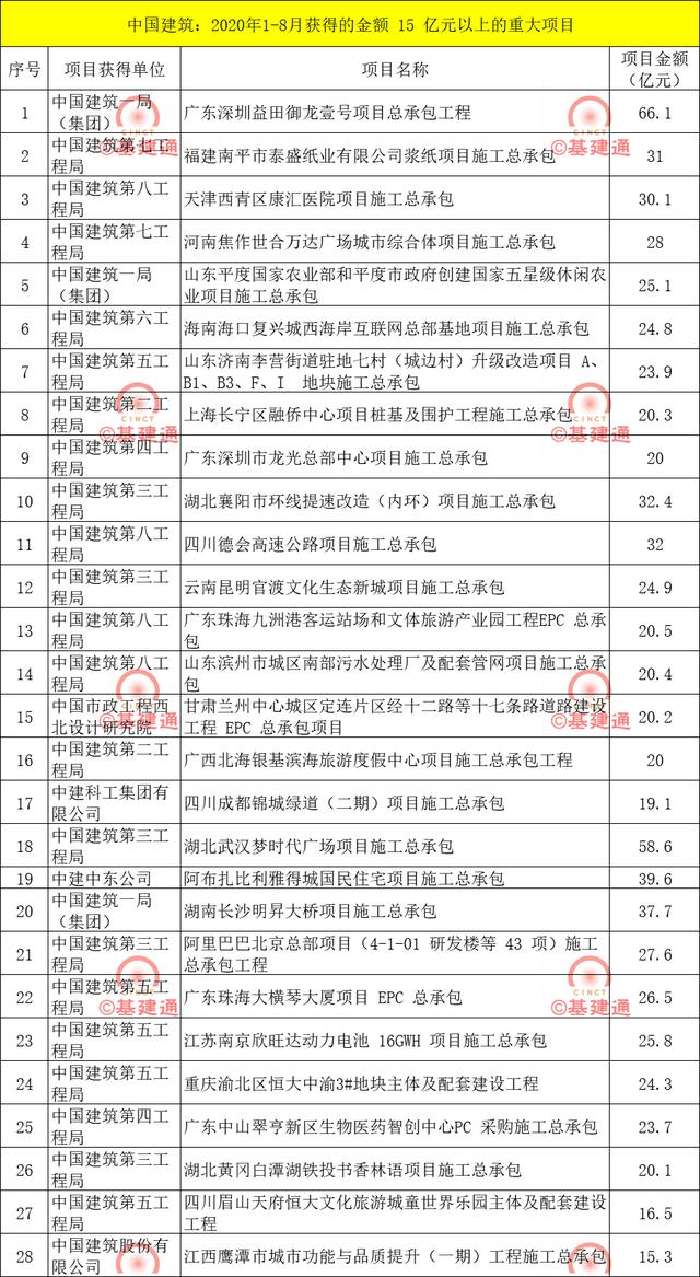 8 月 22 日,中国建筑发布了本月获得的金额 15 亿元以上的重大项目清单,累加上前7 个月的数据,2020 年 1-8 月份中国建筑获得的金额 15 亿元以上的重大项目共计约 87 项,项目合同额约 2652 亿元。具体的清单: