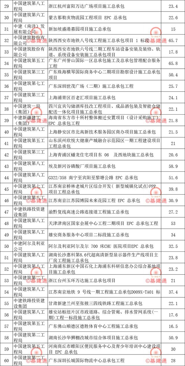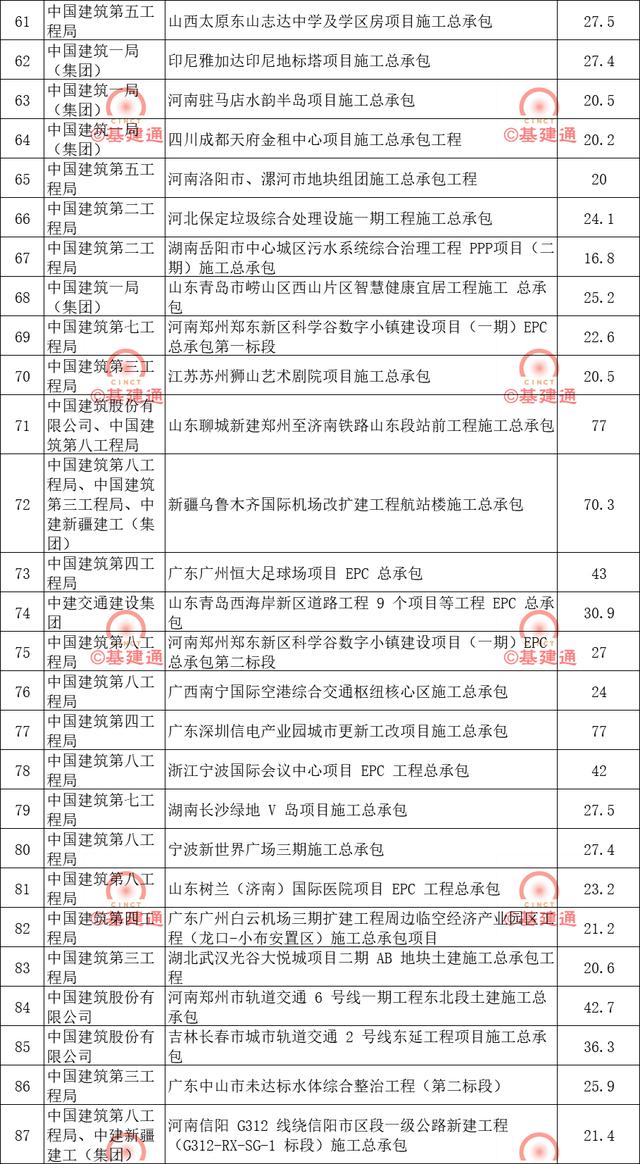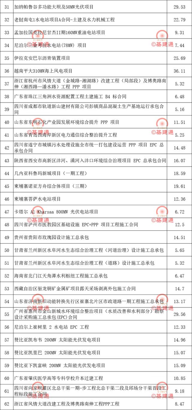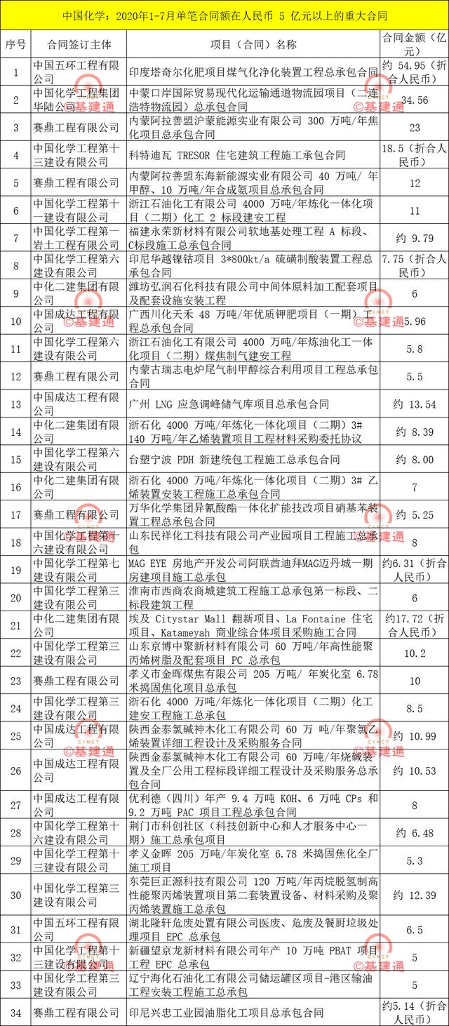 中国化学 2020 年 1-7 月份单笔合同额在人民币 5 亿元以上的重大合同约 34 项,其中不乏海外项目,累计的合同总额折合成人民币约有 379 亿元。具体的项目清单为: