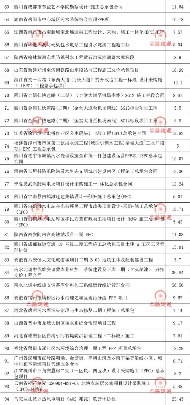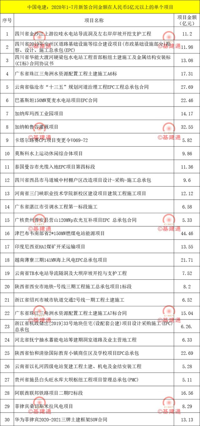 2020 年 1-7 月份,中国电建新签合同金额在人民币 5 亿元以上的单个项目约 94 项,累计项目总额约 1243 亿元。具体的项目清单为: