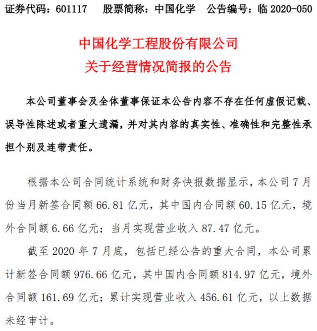 截至 2020 年 7 月底,包括已经公告的重大合同,中国化学工程股份有限公司累计新签合同额 976.66 亿元。