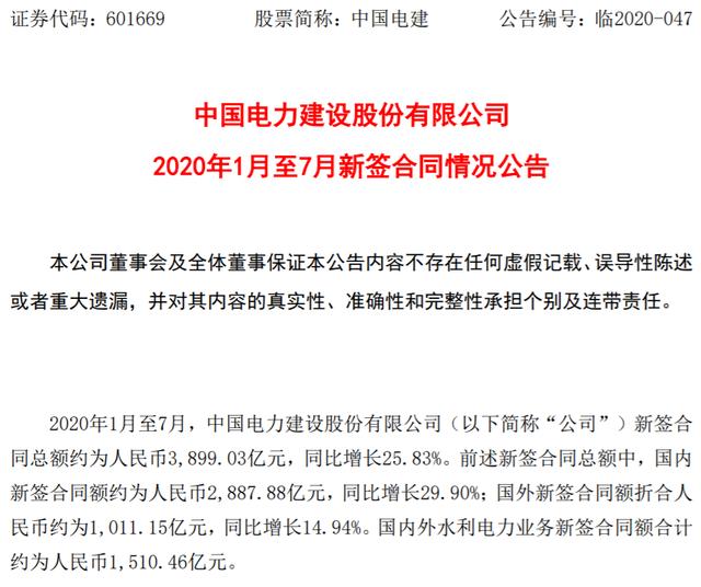 2020 年 1 月至 7 月,中国电力建设股份有限公司新签合同总额约为人民币 3899.03 亿元,同比增长 25.83%。