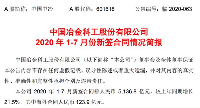 中国冶金科工股份有限公司 (以下简称:中国中冶)2020 年 1-7 月新签合同额人民币5136.8 亿元,较上年同期增长 21.5%,其中海外合同人民币 123.9 亿元。