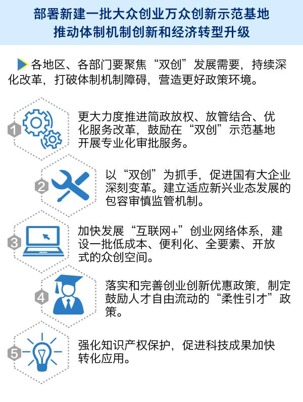 会议还部署新建一批大众创业万众创新示范基地,推动体制机制创新和经济转型升级;通过《志愿服务条例(草案)》以及研究了其他事项。