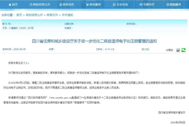 9月9日,四川省住房和城乡建设厅发布《关于进一步优化二级建造师电子化注册管理的通知》。