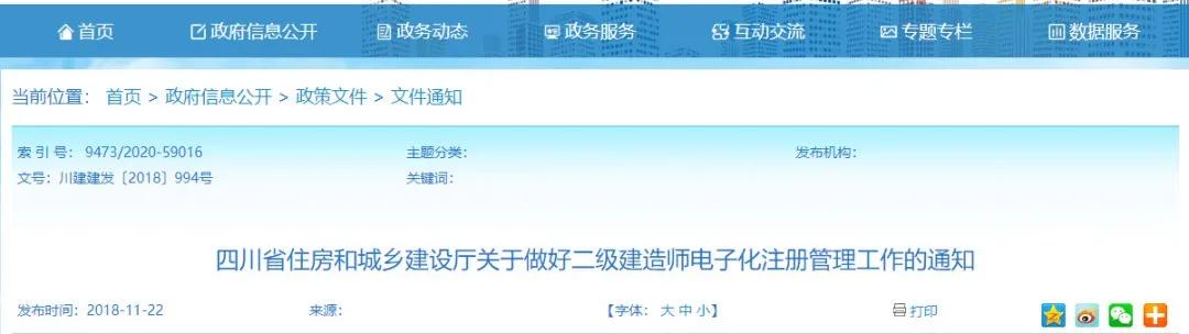 2018年11月22日,四川省住建厅发布了《关于做好二级建造师电子化注册管理工作的通知》。