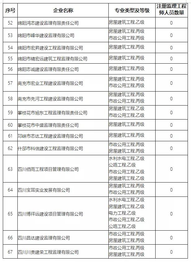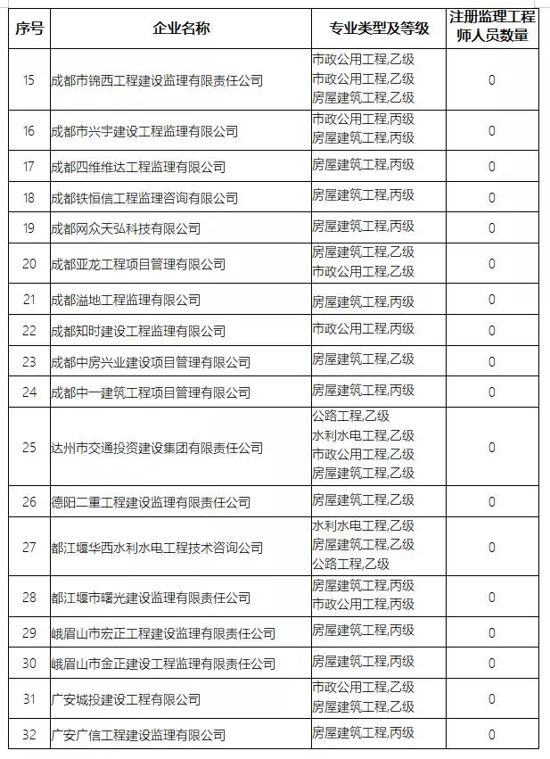 根据《中华人民共和国行政许可法》第70条、《工程监理企业资质管理规定》(建设部令第158号)第23条规定,对巴中欧铭项目管理有限公司等155家不符合资质条件的工程监理企业,自发文之日起限期6个月整改。整改期满后,仍不符合资质条件的,依法依规撤回相应资质。在整改期内,企业可依法陈述、申辩。需陈述、申辩的企业应于2021年4月30日前将申诉材料报四川省住房和城乡建设厅(地址:成都市人民南路四段36号,联系人:罗飞、曾杰,联系电话:028-85563038、85080802)。