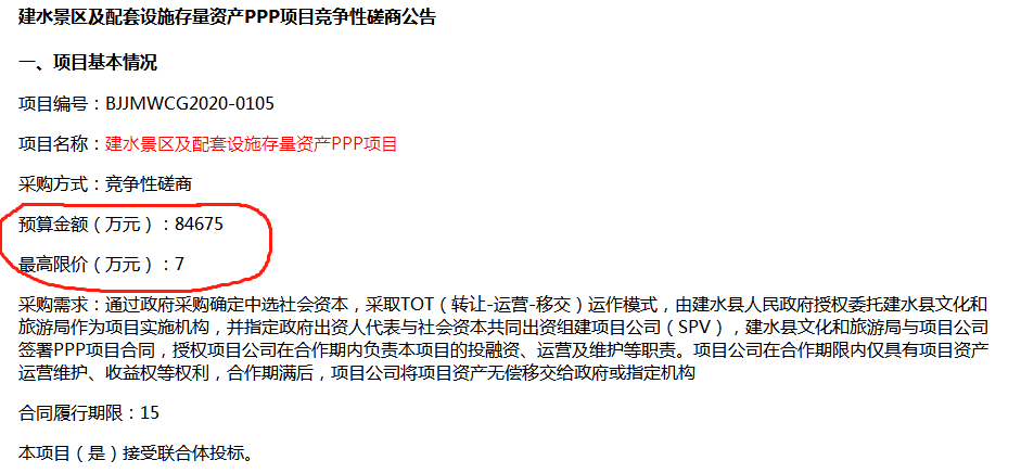 我们从向招标公告信息中可以看到:本项目为PPP项目,采用竞争性磋商的方式进行评选。项目总预算为84675万元,结果最高限价居然只有7万元?