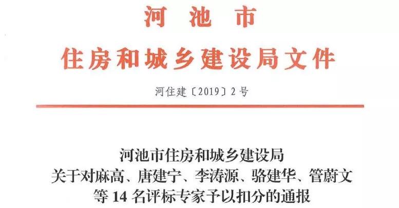 麻高、骆建华、陈婕、于芳、张雁秋、张浩元、甘瑞彬、黎绍武等8名评标专家管理考核扣20分,并自2019年1月25日起暂停12个月评标专家资格。