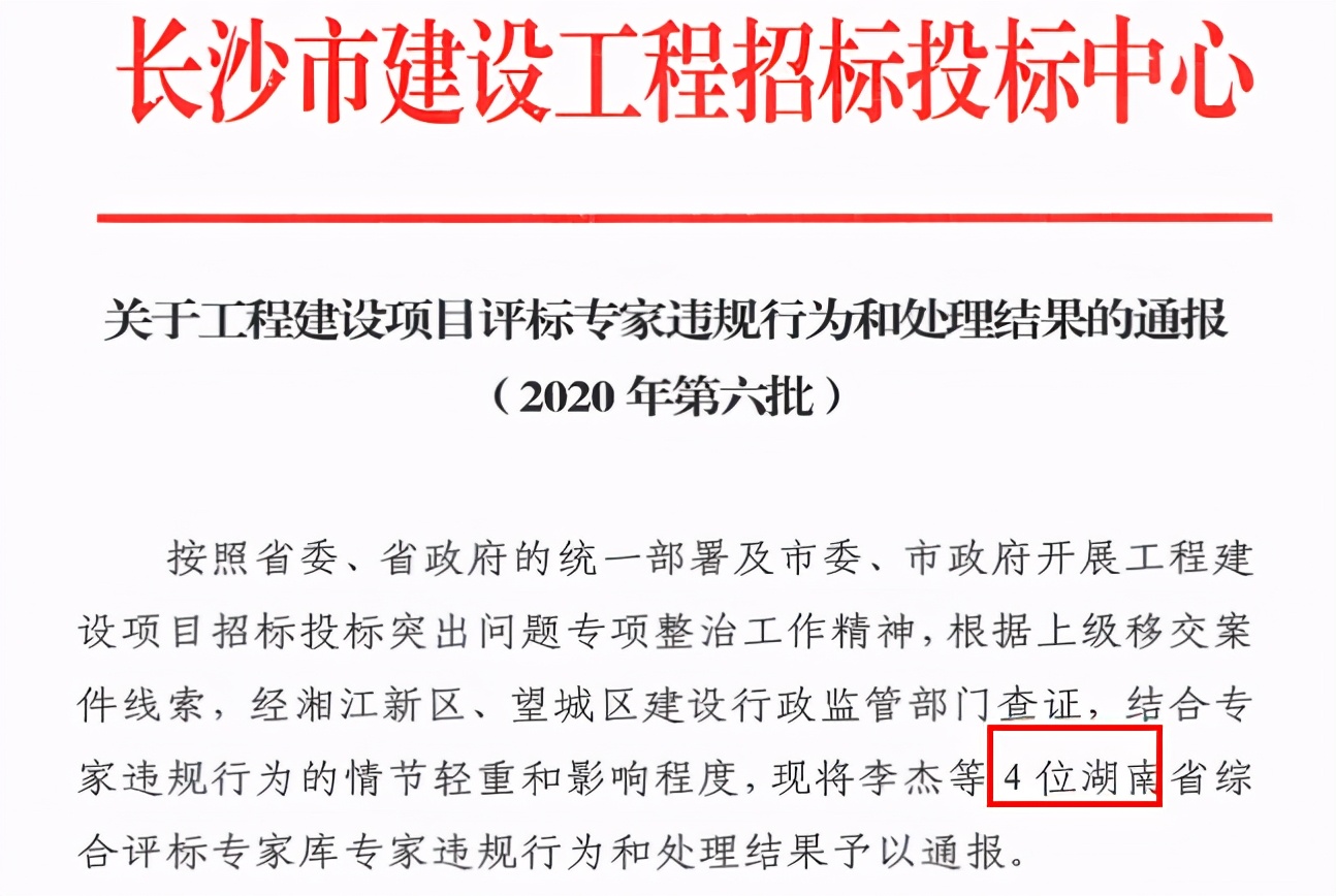 2、2020年9月至今,湖南长沙公布了6批评标专家违规违纪处理情况,26名评标专家被通报。