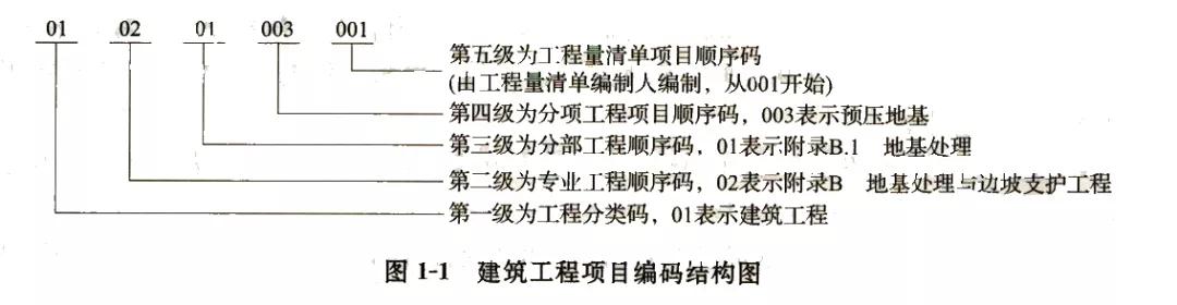⑤第五级分三位(十、十ー、十ニ位),表示工程量清单项目顺序码。建筑工程项目编码结构如图1-1所示。