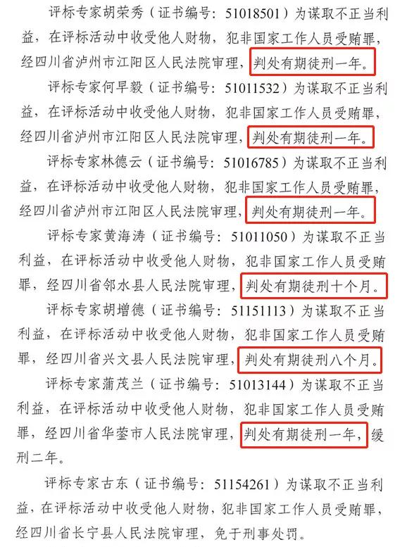 19名评标专家被取消资格,不得再参加任何项目评标,其中11人被判处有期徒刑,8个月到11年不等。