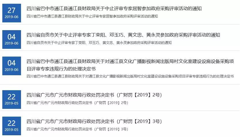 2019年,据四川政府采购网通报信息显示,至少80名评审专家因为各种违规行为被处罚,处罚名单结果在网上公示。