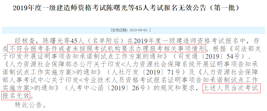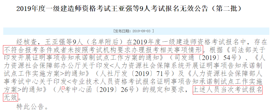 2020年度一级建造师资格考试李国欣等19人考试成绩无效公告