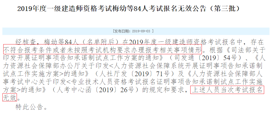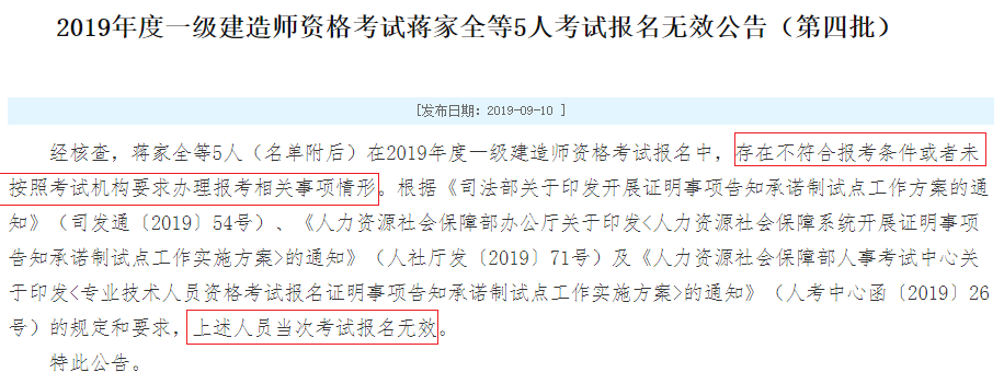 经考后核查,报名参加2020年度一级建造师资格考试的李某等19人(名单附后),存在不符合报考条件或者未按照资格审核部门(机构)要求办理报考相关事项情形。根据《司法部关于印发开展证明事项告知承诺制试点工作方案的通知》(司发通〔2019〕54号)、《人力资源社会保障部办公厅关于印发<人力资源社会保障系统开展证明事项告知承诺制试点工作实施方案>的通知》(人社厅发〔2019〕71号)及《人力资源社会保障部人事考试中心关于印发<专业技术人员资格考试报名证明事项告知承诺制试点工作实施方案>的通知》(人考中心函〔2019〕26号)的规定和要求,上述人员当次考试全部科目成绩无效。