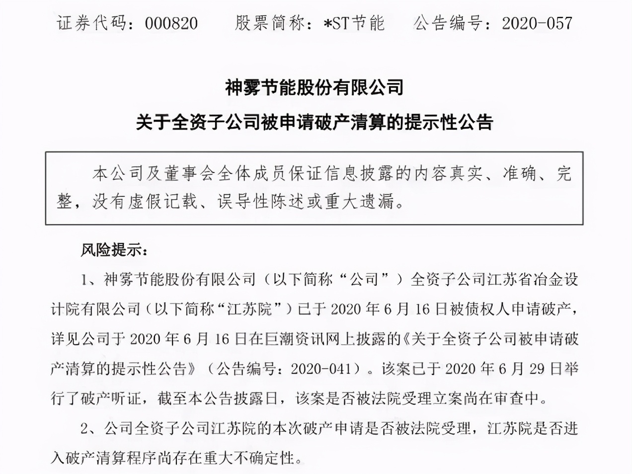 早在2020年7月6日,神雾节能发布公告,神雾系核心资产之一江苏省冶金设计院有限公司被申请破产清算。