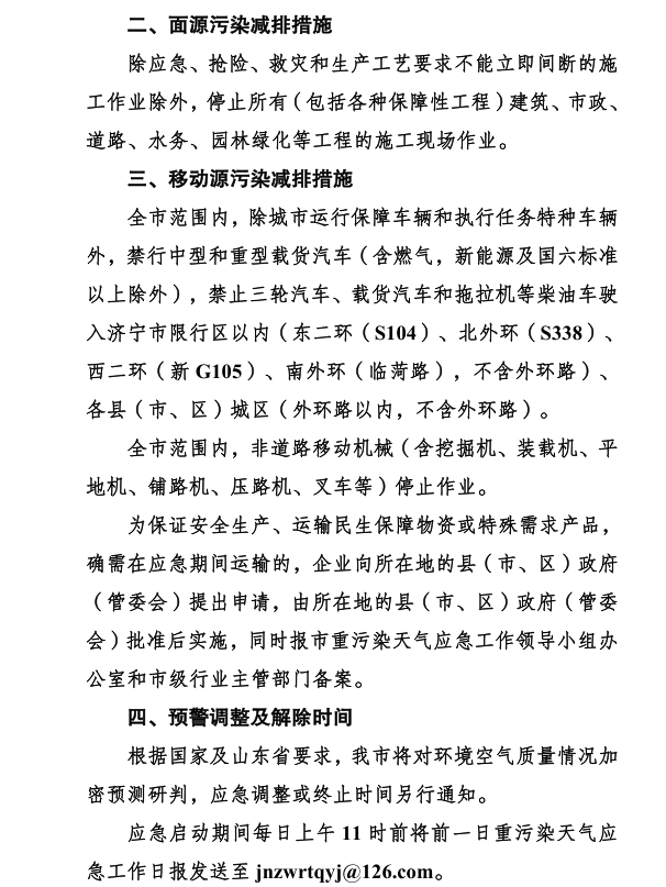 请各成员单位严格按照潍坊市人民政府办公室印发的《潍坊市重污染天气应急预案》(潍政办字〔2019〕132号)启动应急响应,其中,工业企业要按照最新修订的应急减排清单严格落实减排措施,应停即停,应限即限;除涉及重大民生工程、安全生产及应急抢险任务外,停止可能产生扬尘的港口作业、矿山开采、砂石料场、石材加工、商品混凝土生产、物料堆场作业、建筑和拆迁施工及长距离工程等涉及土石方作业环节,施工工地停止建筑拆除、喷涂粉刷、护坡喷浆、混凝土搅拌等;潍坊主城区、各县市区城区(外环路以内)禁行建筑垃圾和渣土运输车、混凝土罐车、砂石运输车等中型和重型载货汽车(含燃气,新能源及国六标准以上除外)以及三轮汽车、低速载货汽车和拖拉机等柴油车。全市范围内非道路移动机械(含挖掘机、装载机、平地机、铺路机、压路机、叉车等)停止作业。