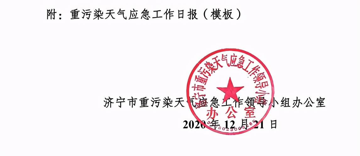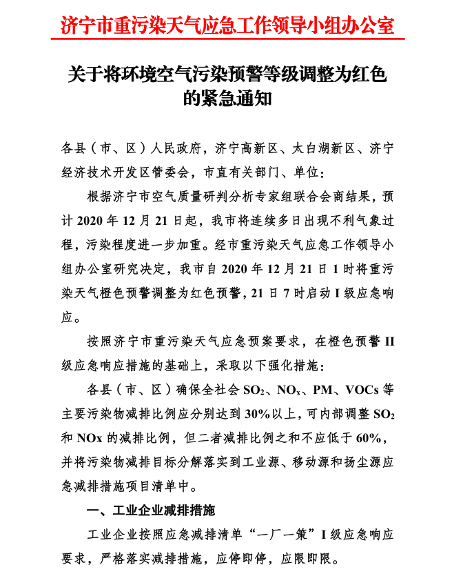 根据济宁市空气质量研判分析专家组联合会商结果,预计2020年12月21日起,济宁市将连续多日出现不利气象过程,污染程度进一步加重。经市重污染天气应急工作领导小组办公室研究决定,济宁市自2020年12月21日1时将重污染天气橙色预警调整为红色预警,21日7时启动I级应急响应。