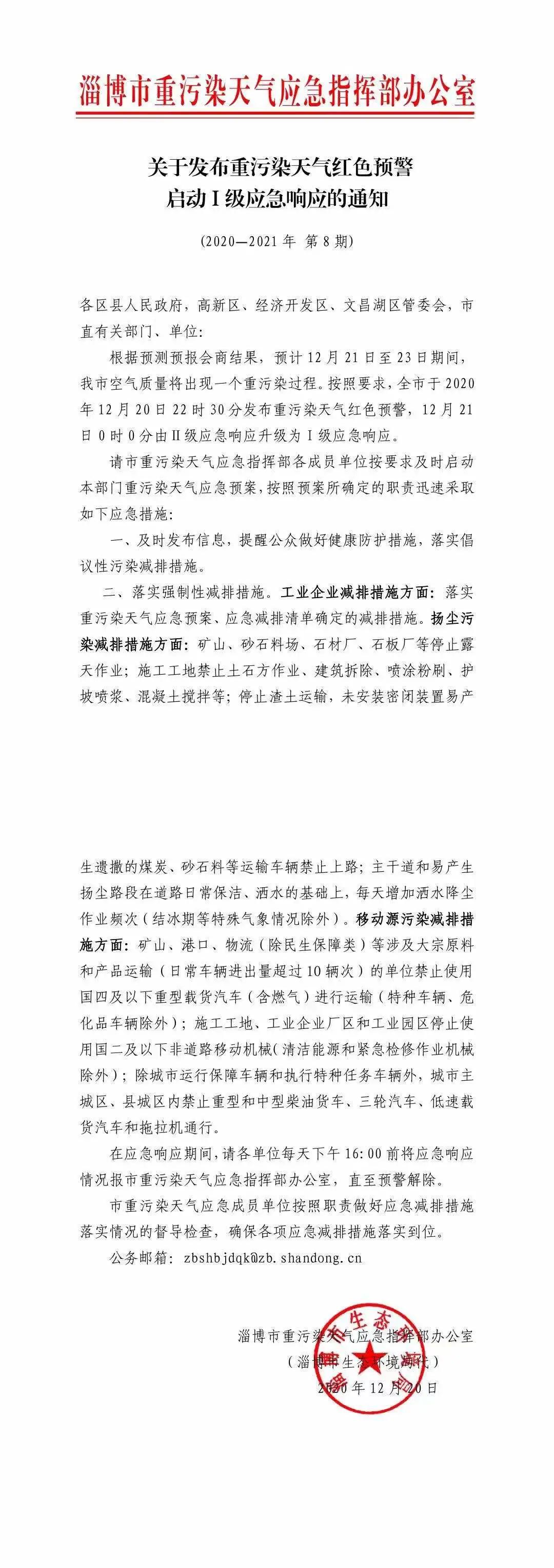 淄博市重污染天气应急指挥部办公室发布重污染天气红色预警启动Ⅰ级应急响应通知,预计12月21日至23日期间,淄博市空气质量将出现一个重污染过程。