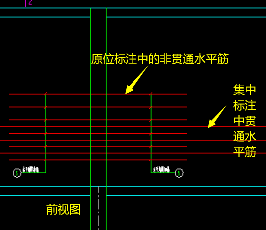 地下室外墙的原位标注,代表水平非贯通筋,以H开头,注明钢筋强度等级、直径、分布间距,以及自支座中线向两侧跨内的延伸长度,当两侧长度相同时可在一侧标注。原位标注中的水平非贯通筋与集中标注中的水平贯通筋“隔一布一”方式间隔布置。