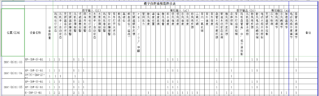 楼宇自动化系统(BAS)是智能大厦中的一个集成子系统,主要功能是实施对大楼内变配电、照明、电梯、空调、供热、给排水、消防、保安等众多分散设备的运行、安全状况、能源使用状况及节能管理实行集成监控、联动和管理。楼宇自控中的监控信息点位表是一张完整的用户需求表,监控信息点位表上会清晰告诉你用户需要对楼宇中的机电设备做什么样的监视和控制。要想读懂点表需求,抓住这4个要点。