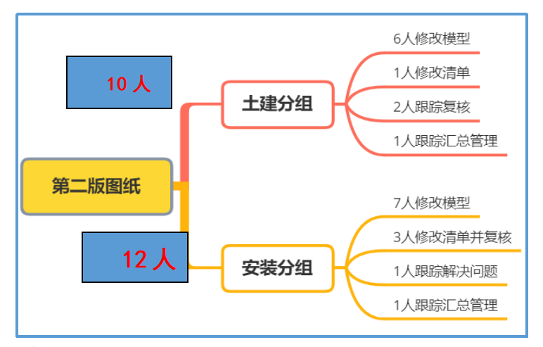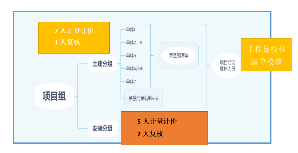 1. 第一次控制价编制,根据5天时间安排相应人员进行计量计价2. 根据询匠项目管理流程,分拆了计量人员、计价人员、无图开项人员、计量计价复核人员、项目经理整体把控