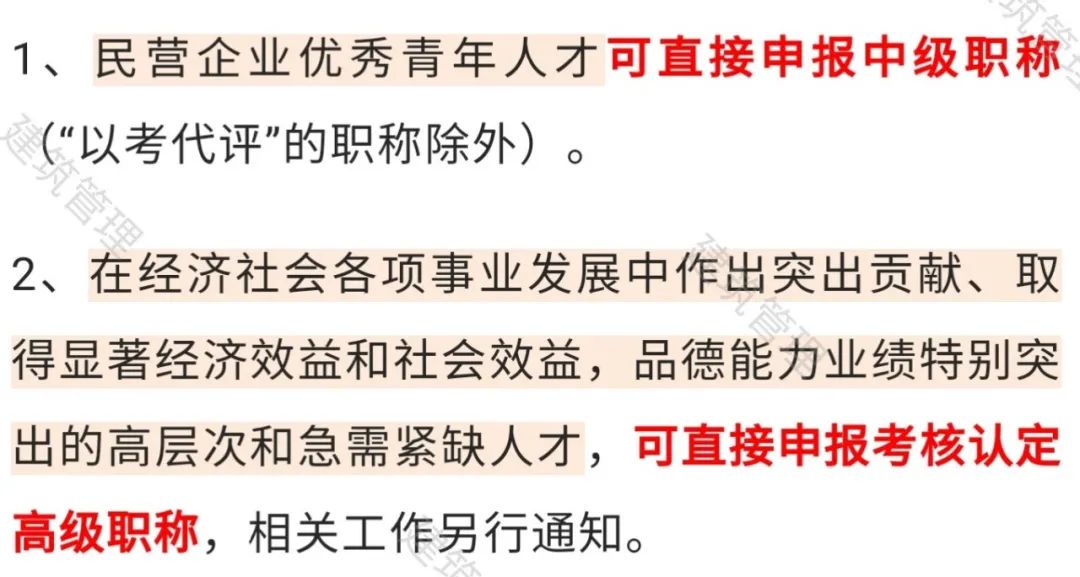 建立职称评审“绿色通道”或“直通车”,民营企业高层次专业技术人才、急需紧缺人才、优秀青年人才可直接申报相应级别职称。