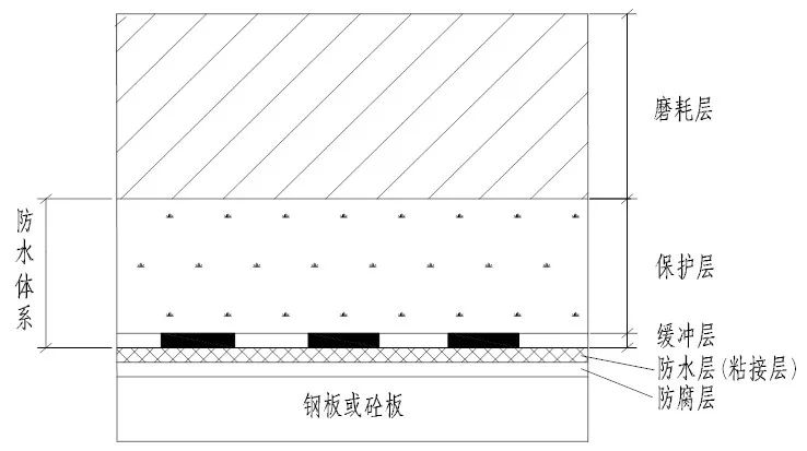 防水层保护桥面板不受路表水的侵害,并与桥面板和相邻铺装层形成抗剪连接的各层组合体,一般由具有防水、粘接性能的层次组成。根据体系的需要还将设置缓冲层。
