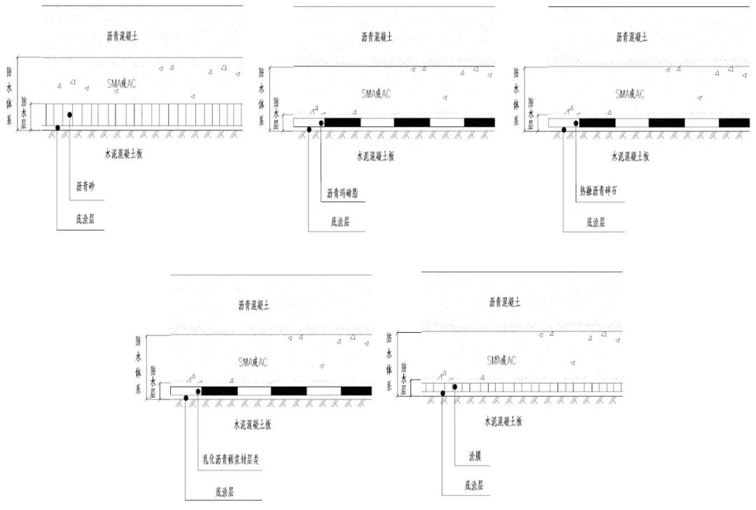 2、各级公路的大、中、小桥宜用沥青砂、涂膜、热融沥青碎石、稀浆封层、卷材等做防水层,并视具体情况设置专门的底涂层加强联接作用。下面层是防水体系的重要组成部分,可选用密级配沥青混凝土、沥青玛蹄脂碎石(SMA )等组成防水体系。应严格控制沥青混合料的现场空隙率。
