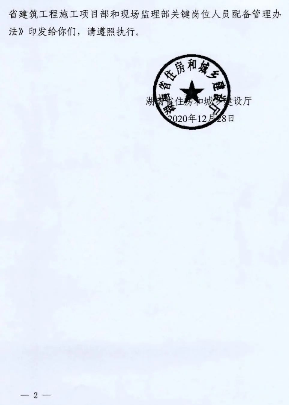 近日,湖南省住建厅发布《湖南省建筑工程施工项目部和现场监理部关键岗位人员配备管理办法》,自2021年3月15日起实施。